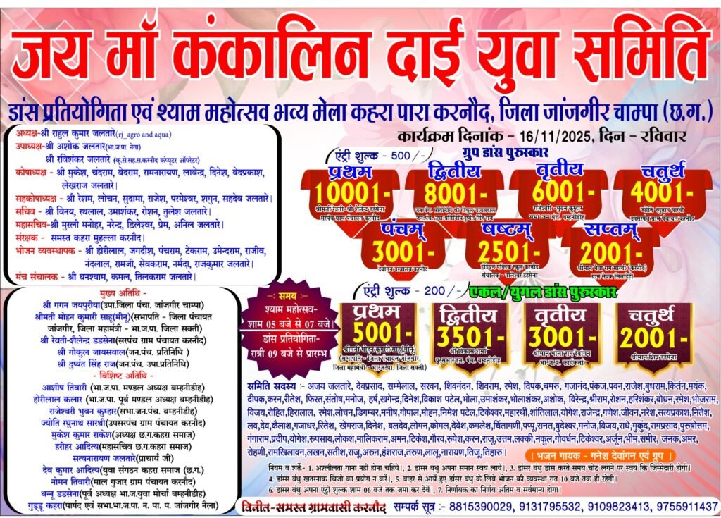 जांजगीर-चांपा @hemant-jaiswal :- जनपद पंचायत बम्हनीडीह के करनौद कहरा मोहल्ला में जय मां कंकालिन दाई युवा समिति के तत्वावधान में 16 नंवबर को श्याम महोत्सव मेला एवं डांस प्रतियोगिता का आयोजन किया जाएगा,जिसमें कार्यक्रम के मुख्य अतिथि गगन जयपुरिया,श्रीमति मोहनकुमारी साहू अध्यक्षता श्रीमति रेवती-शैलेन्द्र डडसेना सरपंच करेगें।