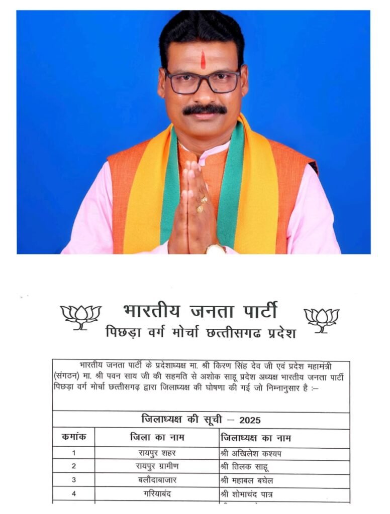 गरियाबंद,- भारतीय जनता पार्टी (भाजपा) छत्तीसगढ़ द्वारा पंडरा माली समाज के तीन प्रमुख और सक्रिय सदस्यों को संगठन में महत्वपूर्ण जिम्मेदारियां दिए जाने से जिले भर के समाज और पार्टी कार्यकर्ताओं में भारी उत्साह और हर्ष का माहौल व्याप्त है। पार्टी नेतृत्व ने जमीनी स्तर पर काम करने वाले इन वरिष्ठ नेताओं की निष्ठा और जनाधार को देखते हुए उन्हें प्रांतीय और जिला स्तर पर महत्वपूर्ण पदों पर नियुक्त किया है।