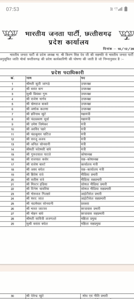 छत्तीसगढ़ भाजपा की अनुसूचित जाति मोर्चा की कार्यकारिणी घोषणा गरियाबांद से मिली चंद्रशेखर सोनवानी को प्रदेश प्रवक्ता का जिम्मेदारी दी गई हैं