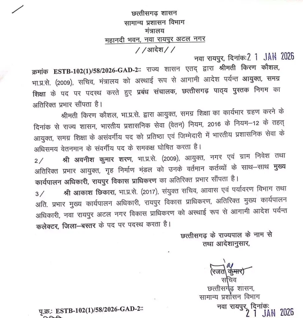 आदेश के अनुसार, किरण कौशल, भा.प्र.से. (2009), जो वर्तमान में सचिव, मंत्रालय के पद पर कार्यरत हैं, को अस्थायी रूप से आगामी आदेश पर्यन्त आयुक्त, समग्र शिक्षा के पद पर पदस्थ किया गया है। इसके साथ ही उन्हें प्रबंध संचालक, छत्तीसगढ़ पाठ्य पुस्तक निगम का अतिरिक्त प्रभार भी सौंपा गया है।
