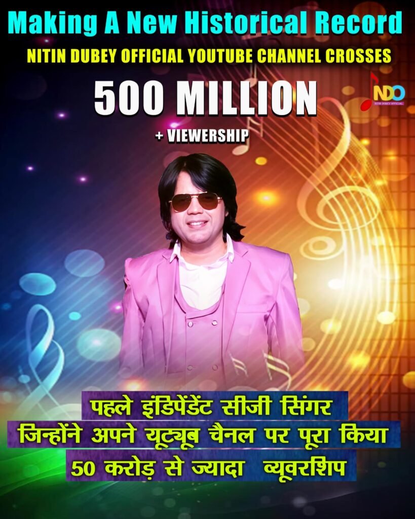नितिन दुबे ने अपने यूट्यूब चैनल “Nitin Dubey Official” पर 500 मिलियन (50 करोड़) से ज़्यादा व्यूवरशिप पूरी कर ली है। इसी के साथ वे अपने निजी चैनल पर 50 करोड़ व्यू पाने वाले पहले इंडिपेंडेंट सीजी सिंगर बन गए हैं। यही नहीं, नितिन दुबे अब यूट्यूब पर सबसे ज़्यादा देखे जाने वाले छत्तीसगढ़ी सिंगर भी बन चुके हैं।