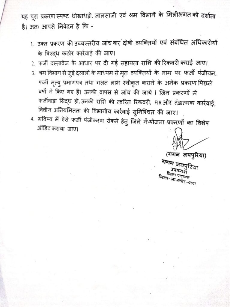 श्री जयपुरिया ने कहा कि यह मामला केवल एक व्यक्ति तक सीमित नहीं हो सकता, बल्कि श्रम विभाग से जुड़े दलालों एवं अधिकारियों की संलिप्तता की आशंका से इनकार नहीं किया जा सकता। उन्होंने दोषियों के विरुद्ध FIR दर्ज कर कठोर कार्रवाई, राशि की रिकवरी तथा जिलेभर में योजनाओं की विशेष जांच एवं ऑडिट कराने की मांग की है।उन्होंने स्पष्ट कहा कि “प्रदेश में भाजपा और सुशासन की सरकार है गरीब एवं श्रमिकों के हक पर डाका डालने वालों को किसी भी स्थिति में बख्शा नहीं जाएगा।