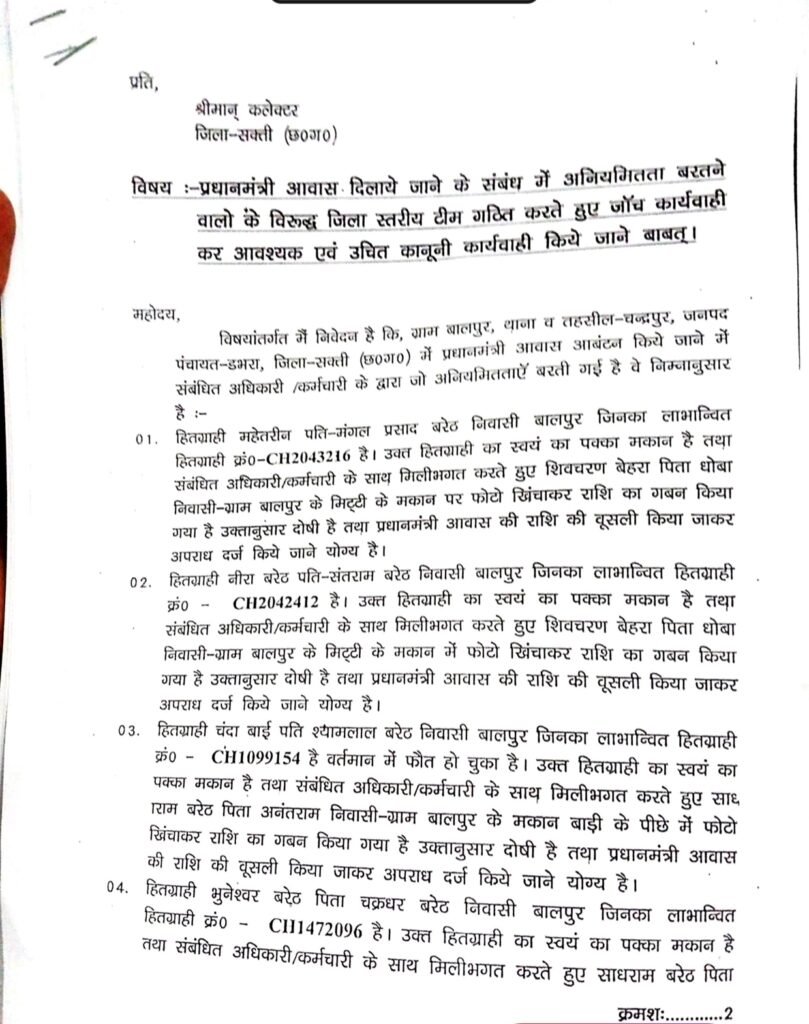शिकायतकर्ता का आरोप है कि प्रधानमंत्री आवास योजना के तहत जिन हितग्राहियों को आवास स्वीकृत किया गया है, उनमें से कुछ के पास पहले से ही पक्के मकान मौजूद हैं। इसके बावजूद उन्हें योजना का लाभ दिया गया। आरोप है कि संबंधित अधिकारी-कर्मचारियों की मिलीभगत से अपात्र व्यक्तियों के कच्चे या अन्य मकानों के सामने फोटो खींचकर ऑनलाइन अपलोड किया गया और योजना की राशि निकाल ली गई।