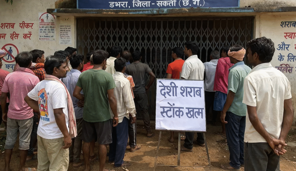 डोलकुमार निषाद@डभरा—सक्ति जिले के डभरा मुख्यालय की शासकीय शराब दुकान में देशी प्लेन शराब का स्टॉक खत्म होते ही क्षेत्र में असंतोष खुलकर सामने आ गया है। स्थानीय उपभोक्ताओं का कहना है कि बार-बार स्टॉक खत्म होना अब सामान्य समस्या बन चुकी है, जिससे उन्हें परेशानी और अतिरिक्त खर्च दोनों झेलने पड़ रहे हैं।
