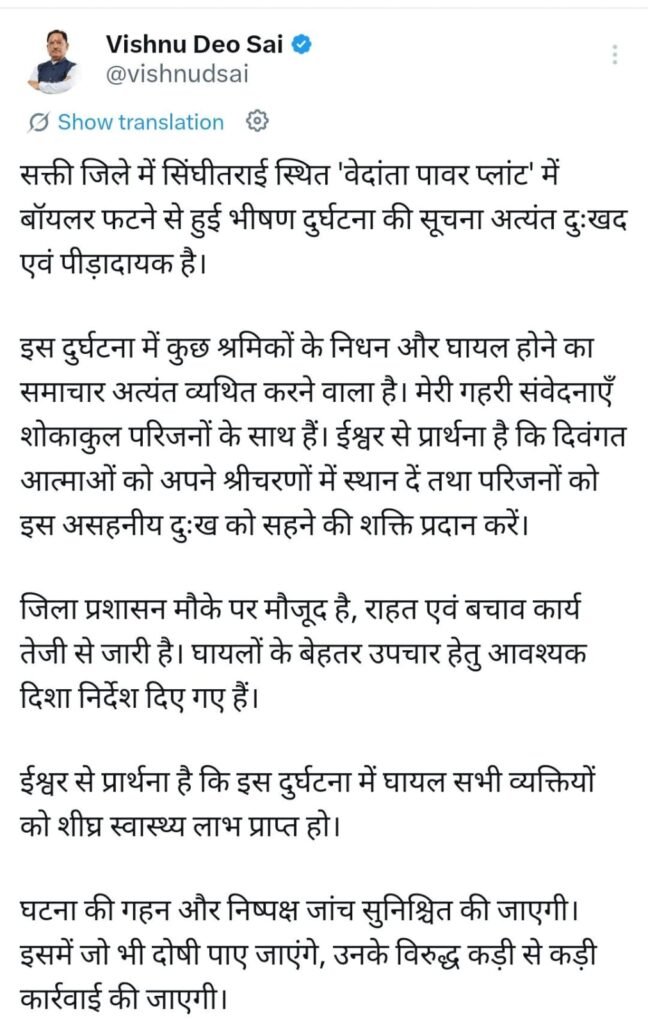 सीएम साय ने सोशल मीडिया प्लेटफॉर्म ‘एक्स’ पर पोस्ट करते हुए कहा कि यह हादसा बेहद दुःखद और पीड़ादायक है। इस घटना में श्रमिकों की मृत्यु और कई लोगों के घायल होने की खबर ने उन्हें अत्यंत व्यथित किया है।